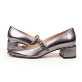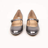 These Stuart Weitzman Mary Jane heels feature a metallic silver leather upper with a classic round toe, adjustable strap, and sturdy block heel. Timeless, chic, and versatile, they offer comfort and understated elegance for both day and evening wear.