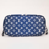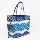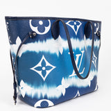 The Louis Vuitton Escale MM Tote is a statement piece that captures the spirit of summer with its gradient shades of blue, white, and navy blue. Crafted from Monogram Giant in coated canvas, the tote bag features navy blue cowhide-leather trim, silver-tone hardware, and spacious open-top construction with side laces that adjust the shape.