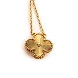 This Van Cleef & Arpels Vintage Alhambra pendant is crafted in 18K yellow gold with a stunning guilloché finish that catches and reflects light beautifully. The iconic four-leaf clover motif symbolizes luck and timeless elegance, making it one of VCA’s most sought-after and collectible designs. Perfect as an everyday luxury piece or layered with other fine jewelry, this pendant brings dimension, texture, and unmistakable VCA craftsmanship.