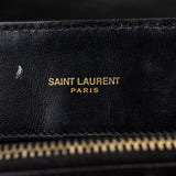 Inside, the bag is lined with luxurious grosgrain fabric and includes a center zip compartment, slip pockets, and dual open sections for functionality. The adjustable leather and chain strap allows for versatile shoulder or crossbody wear. This timeless piece perfectly blends everyday practicality with iconic Saint Laurent glamour.