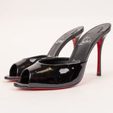 The Christian Louboutin Show Me Dolly Heels feature a sultry open-toe design in glossy black patent leather. Set on the iconic red lacquered sole, these heels combine seductive curves with the brand’s signature Parisian allure.